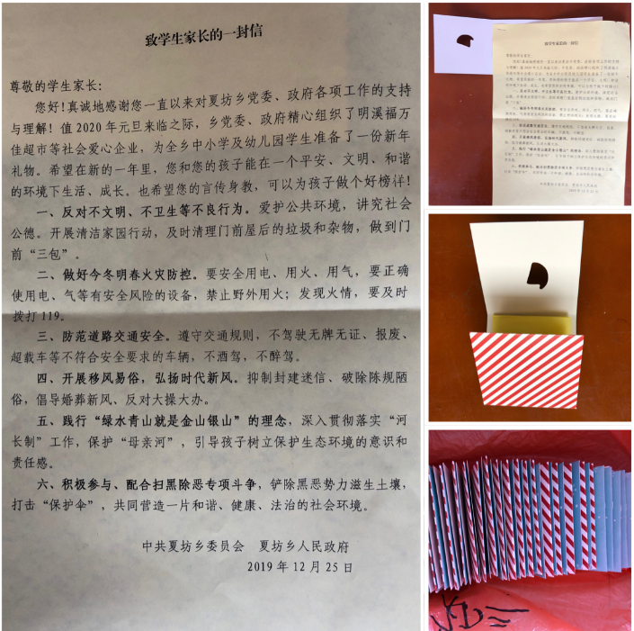 “特殊”的新年礼物里有一张贺卡,里面有乡党委、政府致学生家长的一封信。