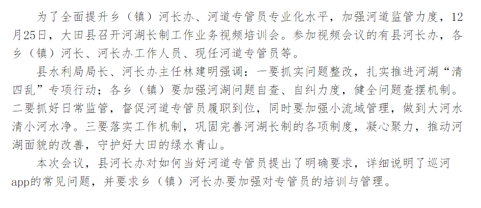 大田县召开河湖长制工作业务视频培训会