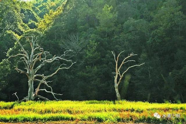 一眼看见那幅大地上的“水墨小品”,我还真有些忘情:河中央两棵灰白色枯树枝杆如花,脚下是浅绿色的草地。它早已枯死,树根插在泥土里,日夜凝视着水中的自己婀娜多姿,阳光透过茂密的树林,落下疏朗的稀疏光线,一群鸳鸯就在这时飞来,从绿荫模糊的背景划过,金黄的身影如同闪电,在枯树四周上下翻飞盘旋,忽地,落在树上两只,渐渐地,纷纷落在水里,落在树枝上,“哦尔、哦尔”地互相招呼。