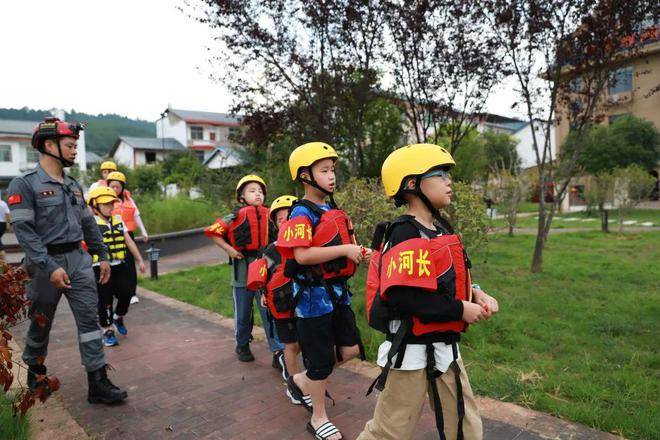 孩子们戴上红袖章,化身“小河长”,在火箭救援防灾减灾社工服务中心人员的带领下开展巡河工作。