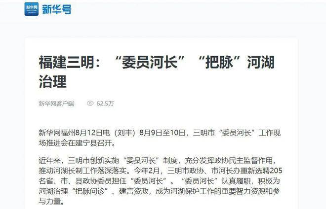 8月12日,新华网客户端刊登《福建三明:“委员河长”“把脉”河湖治理》一文,对三明市“委员河长”工作现场推进会进行报道。