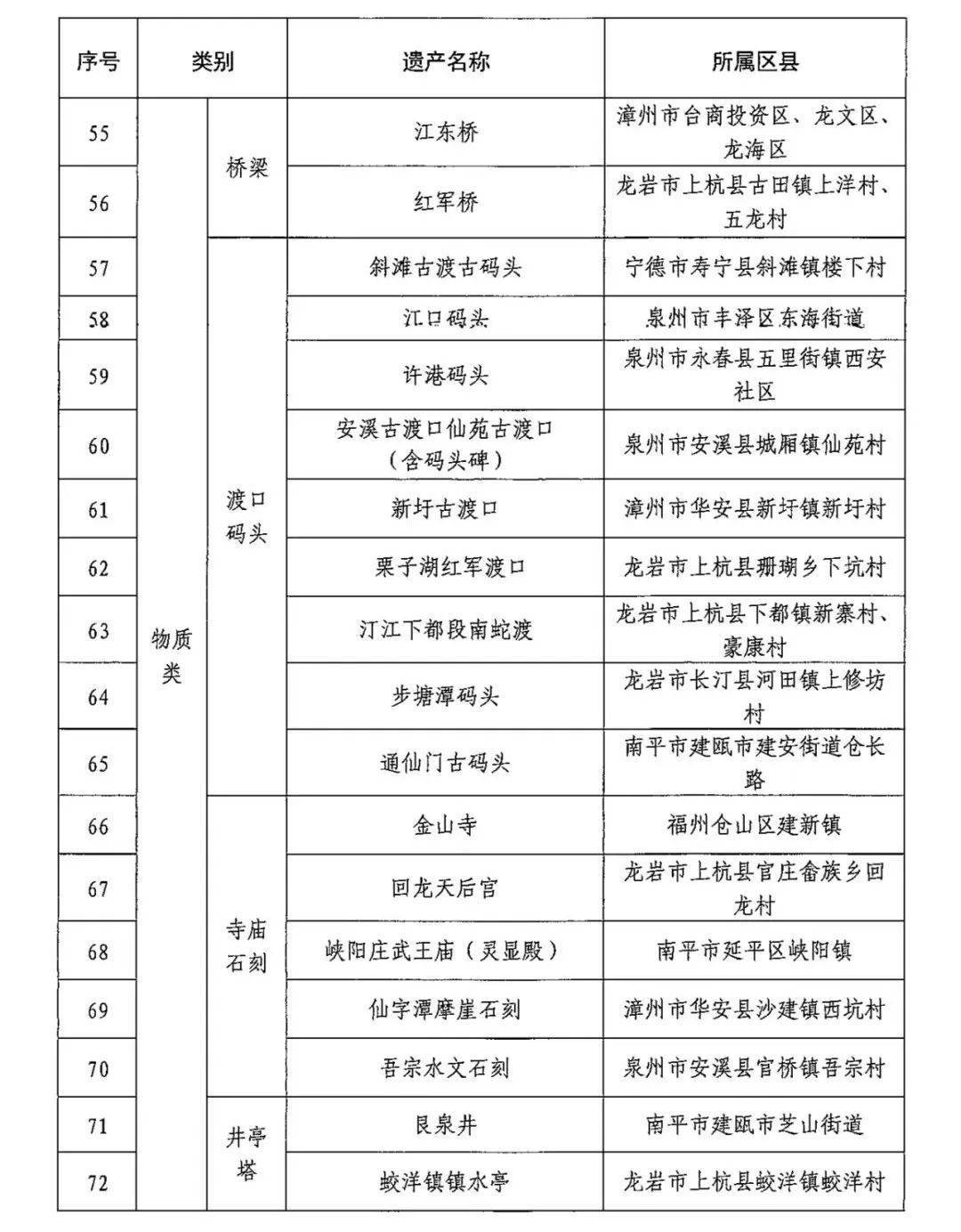 此次公布的名单,是经各地推荐申报、现场复核评估、省级专家评审、处室征求意见和网上公示而最终确定的。其中,物质类77处(含河流15处、湖库18处、沟渠5处、渡槽2处、陂坝4处、桥梁12处、渡口码头9处、寺院石刻5处、井亭塔3处、历史遗址4处)、非物质类3处(含宗教民俗2处、文学艺术1处)。
