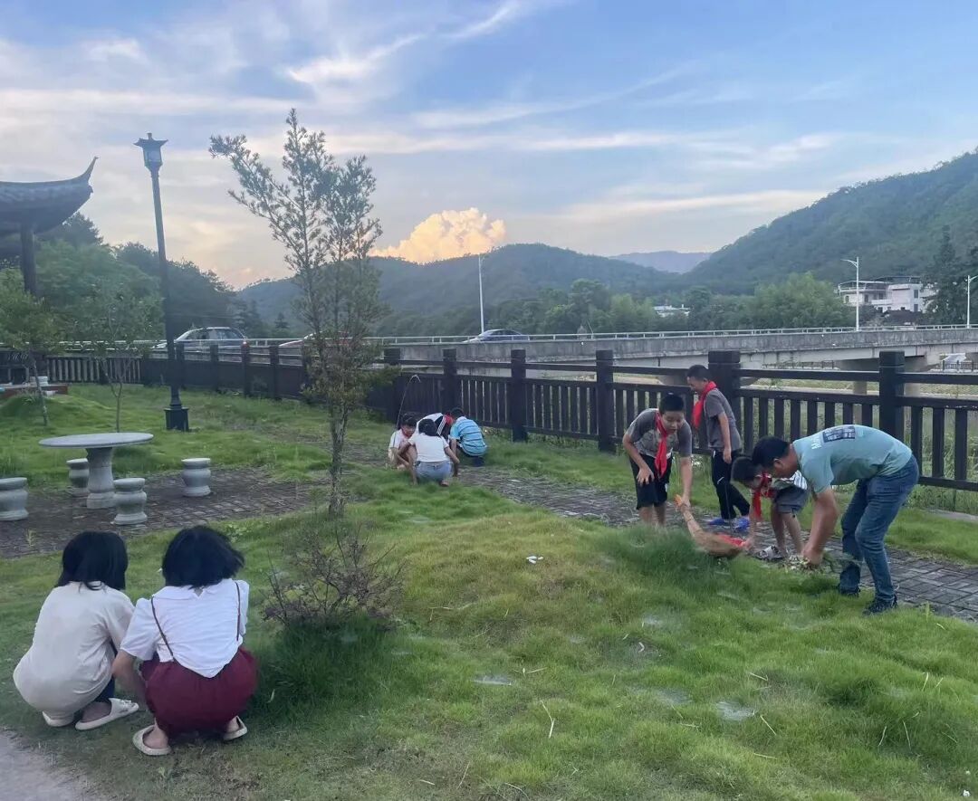 在巡河护河清河、防溺水绿色安全文明教育现场教学活动中,灵地镇水利站负责人严寿华亲自带领红领巾河小禹志愿者们沿罗口溪姚坊村河段河岸边生态巡查步道、公园一边参观巡查河道,一边用自己的双手拔杂草、捡拾河岸边零星垃圾保护河道,并给他(她)们宣传讲解有关保护河流、《节约用水条例》《公民节约用水行为规范》的意义和重要性及暑期防溺水“六不准、四不要、一会”知识等。